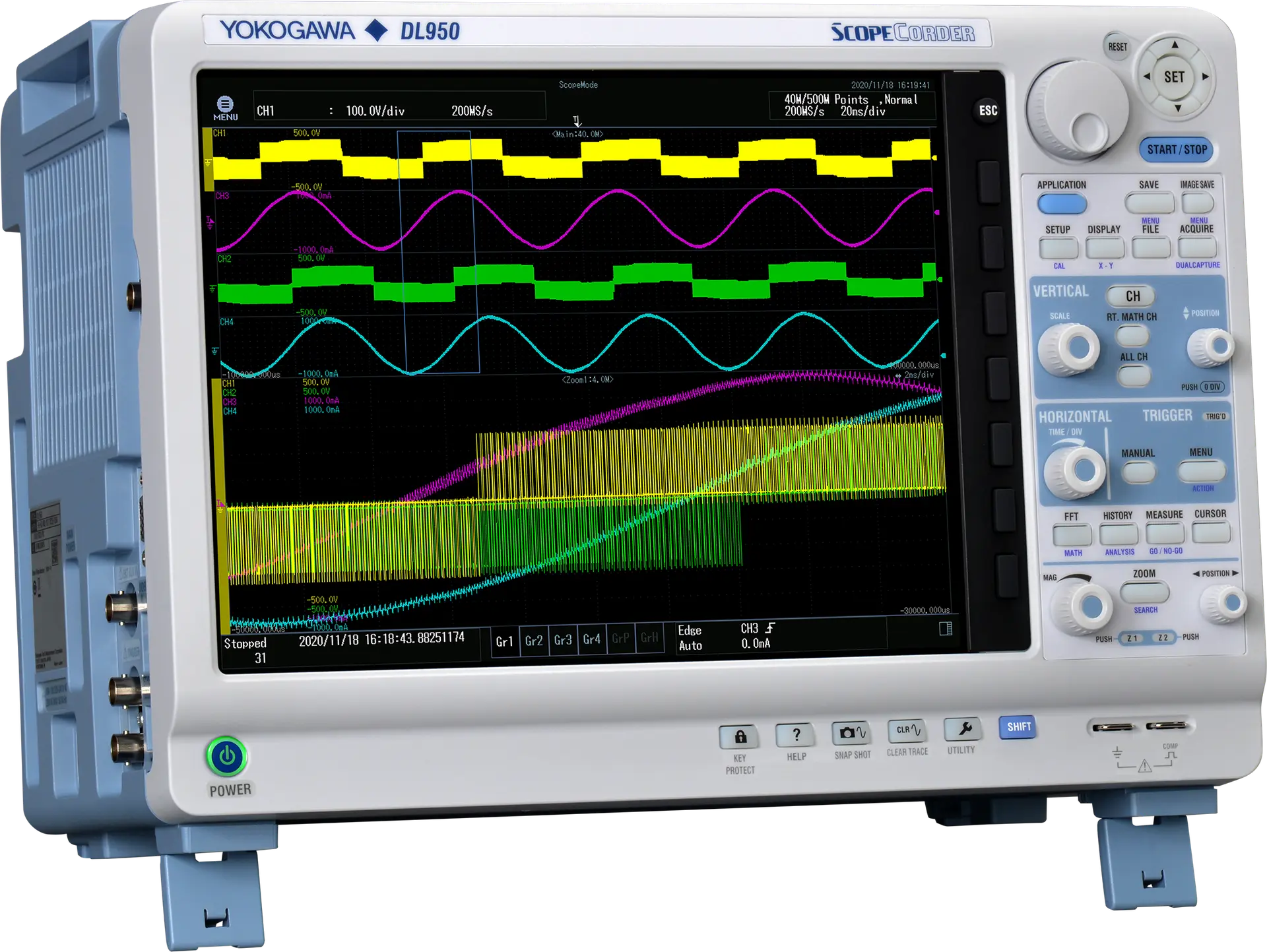 Ein ScopeCorder ist ein Instrument, das ein Oszilloskop und einen tragbaren Datenrekorder in einer modularen Plattform kombiniert, die sowohl schnelle Transienten als auch langsame Trends erfassen kann.