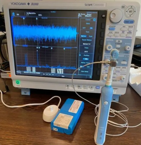 Ebenso einfach ist die Vermessung eines Induktions-Chargers einer elektrischen Zahnbürste oder auch des Beschleunigungssensors auf deren Reinigungskopf. Die Vermessung kann schnell eingelesen und ausgewertet werden. In beiden Fällen kann eine FFT durchgeführt werden, um das Frequenzspektrum auszuwerten.