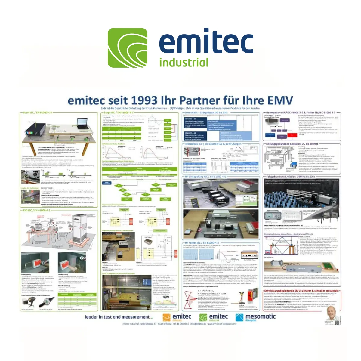 Das Emitec EMV-Poster leitet Sie bei den wichtigsten EMV-Prüfungen an. Bestellen Sie Ihr EMV-Poster in der Grösse A0 und bleiben Sie informiert über den Aufbau und Ablauf der gängigsten EMV-Prüfungen und -Tests.